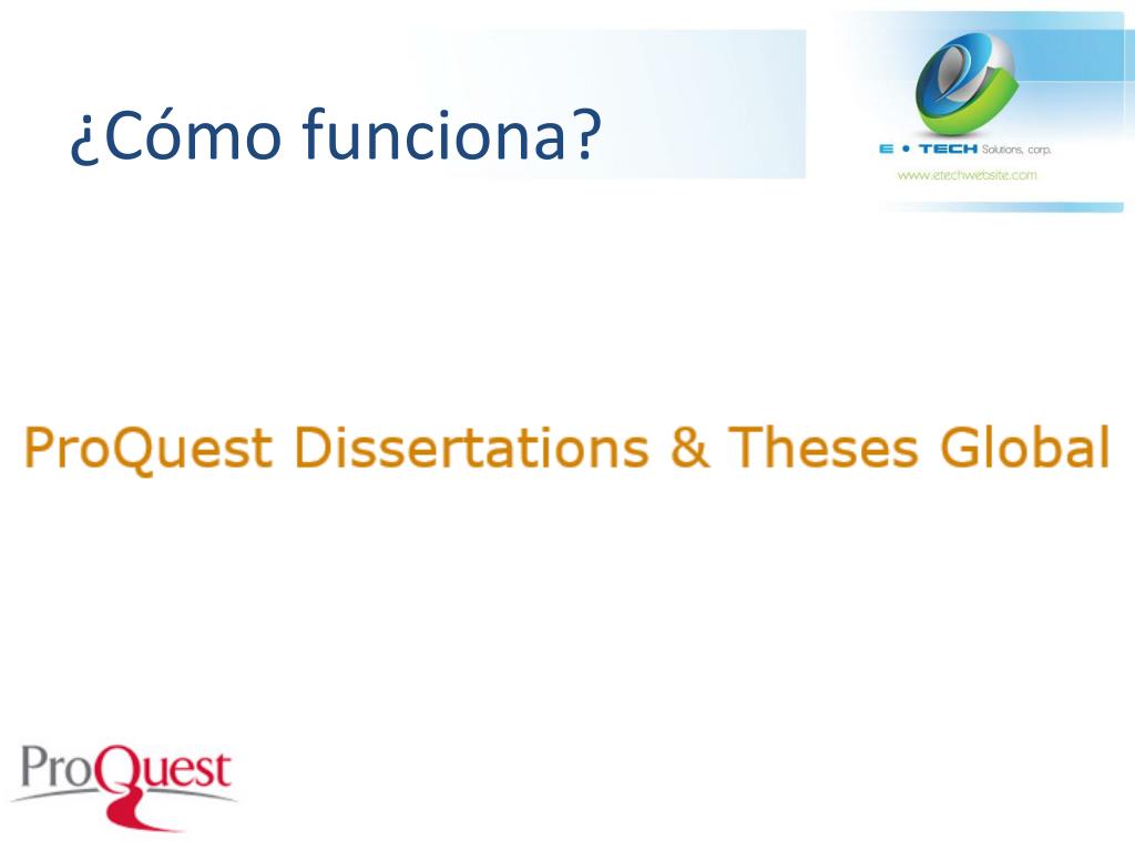 ¿Qué es Dissertation and Theses? ProQuestDissertations & ThesesGlobal es la colección más completa en cuanto a disertaciones y tesis de todo el mundo, que abarca desde 1743 hasta nuestros días y que ofrece el texto completo de las obras de posgrado agregados desde 1997, junto con el texto completo seleccionado de obras escritas antes de 1997. Contiene una gran cantidad de nuevas memorias y tesis internacionales, tanto en citas como en texto completo.