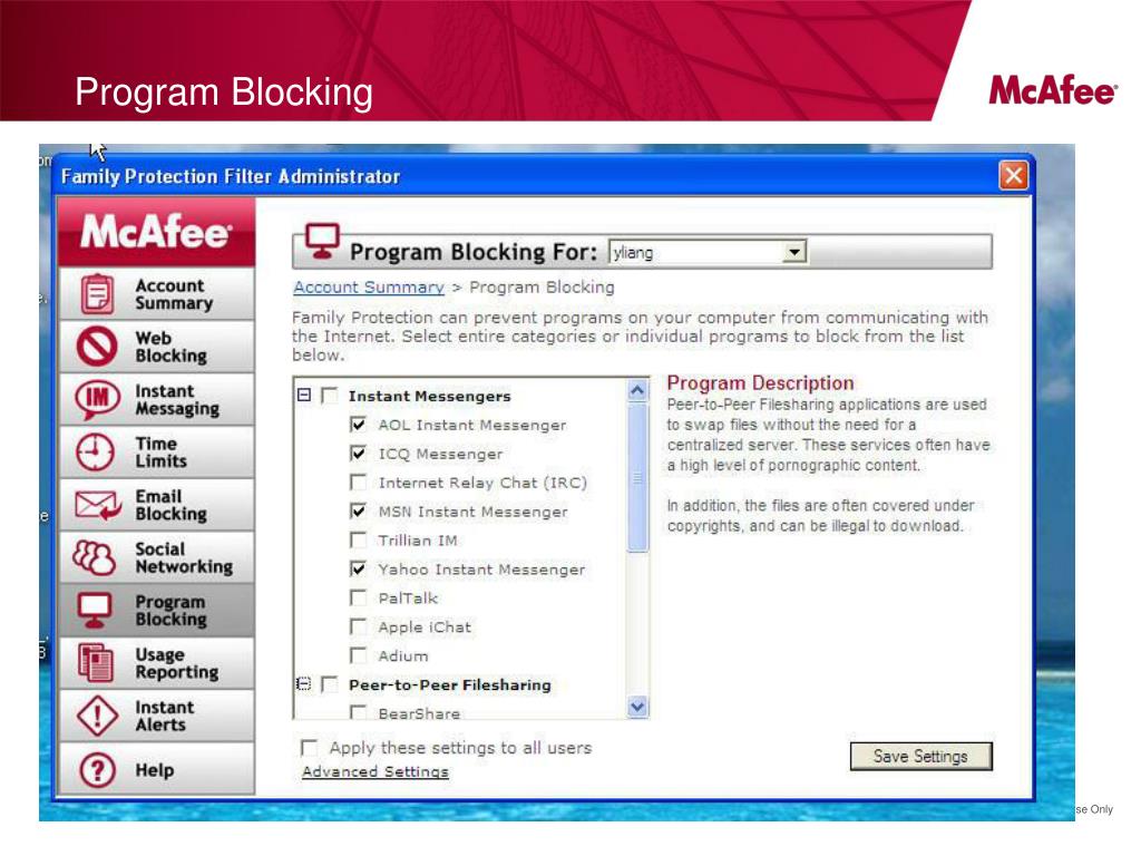 McAfee Family Protection Position Easy Complete Empowering Lets you say “yes” to your children's online interests while keeping them safe as they learn and explore Fast, simple set up so you can start protecting your children within minutes Protects children of all ages from inappropriate content, social networking risks, strangers, and other threats Title of presentation