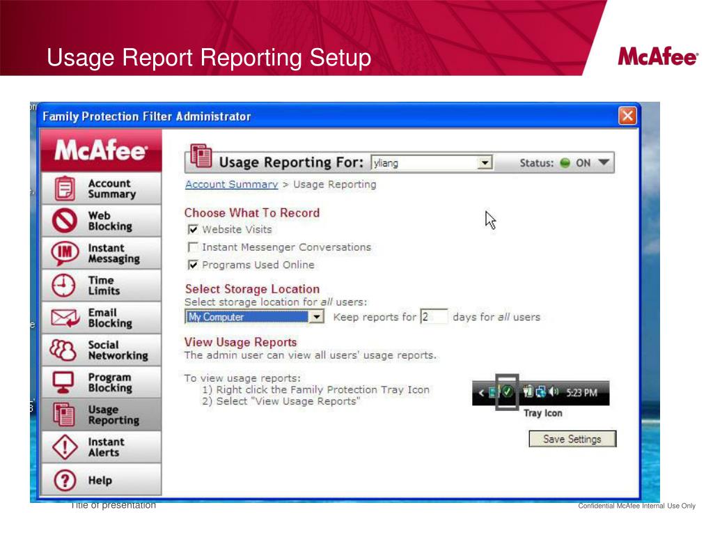 Experiencia del usuario • Interfase amigable con navegación simples para ambos, administrador y niños • Trial y alertas de expiración siguen la metodología tradicional de McAfee • En la primera configuración • Después de la instalación, usuario y clave son solicitados para generar la cuenta administrativa inicial • Defecto: una lista de categorías web son pré seleccionadas para el filtrado, ningún otro control es habilitado. • Icono Desktop y Ícono SysTray estám disponibles para acceder la interfase de principal/ de configuración – entretanto, este producto hace el filtrado en el background sin alertas intrusivos al usuario. • Herramienta en la barra de herramienta del navegador es disponible para búsqueda segura y filtrado web. • Tiempo de ejecución: • Navegación en sitios prohibido llevan a una página de bloqueo • Popups de alertas son ofrecidos con otros tipos de violaciones, por ejemplo, una aplicación de Mensajería Instantánea es bloqueada. • Reportes son accesibles por el icono SysTray • Usted puede generar cuantas cuentas (usuarios) desee para configurar los controles de su familia • Cada cuenta tiene su política asociada por los padres • Caso contrario, la política por defecto es aplicado. • Todas las actualizaciones del producto ocurren automáticamente a través de la web. Title of presentation
