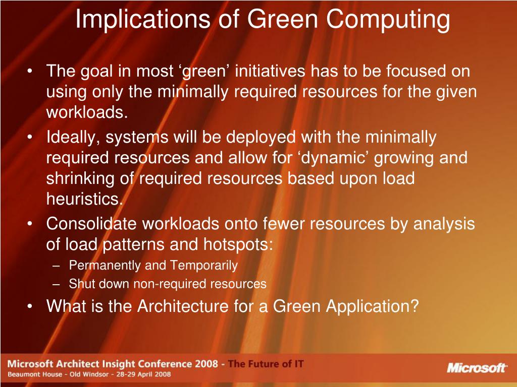 Implications of Green Computing • The goal in most ‘green’ initiatives has to be focused on using only the minimally required resources for the given workloads. • Ideally, systems will be deployed with the minimally required resources and allow for ‘dynamic’ growing and shrinking of required resources based upon load heuristics. • Consolidate workloads onto fewer resources by analysis of load patterns and hotspots: • Permanently and Temporarily • Shut down non-required resources • What is the Architecture for a Green Application?