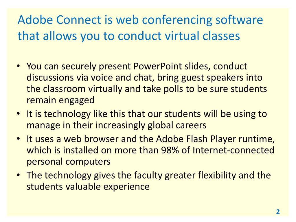 Adobe Connect is web conferencing software that allows you to conduct virtual classes You can securely present PowerPoint slides, conduct discussions via voice and chat, bring guest speakers into the classroom virtually and take polls to be sure students remain engaged It is technology like this that our students will be using to manage in their increasingly global careers It uses a web browser and the Adobe Flash Player runtime, which is installed on more than 98% of Internet-connected personal computers The technology gives the faculty greater flexibility and the students valuable experience
