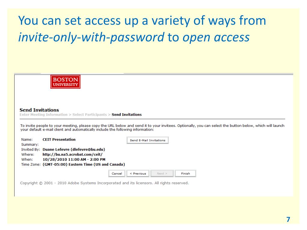 You have several telecomm options from VOIP to BU conference line; some free some not • Voice Over Internet Protocol (VOIP) • No telecom charges for you or your participants • Participants need a ‘non-slow’ net connection for good voice quality • Participants need at least a basic headset (mic and headphones) $25 • Can mute all participants centrally • Ability to record the session and post a URL so participants can go back or those who missed can ‘attend later’ • Capability to transfer the recording to your own PC or server. BU Telecom saves them ‘for a while’ • BU Meet Me phone line 617-353-xxxx • No telecom charge for you or and your local participants • Long distance charges for non-local participants (incl. International) • Limit of 25 people • A BU phone number must be the first on the call to ‘open the line’ • Participants can call from a cell or landline • Limited ability to mute all participants • Cannot record and post audio • Cannot do breakout rooms; all participants will still be in one pool