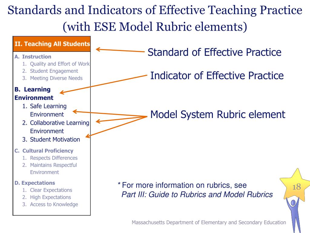 Standards and Indicators of Effective Teaching Practice (with ESE Model Rubric elements) Standard of Effective Practice • Indicator of Effective Practice • Model System Rubric element * For more information on rubrics, see Part III: Guide to Rubrics and Model Rubrics Massachusetts Department of Elementary and Secondary Education