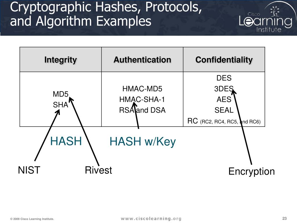 Cryptographic Hashes, Protocols,and Algorithm Examples HASH HASH w/Key NIST Rivest Encryption