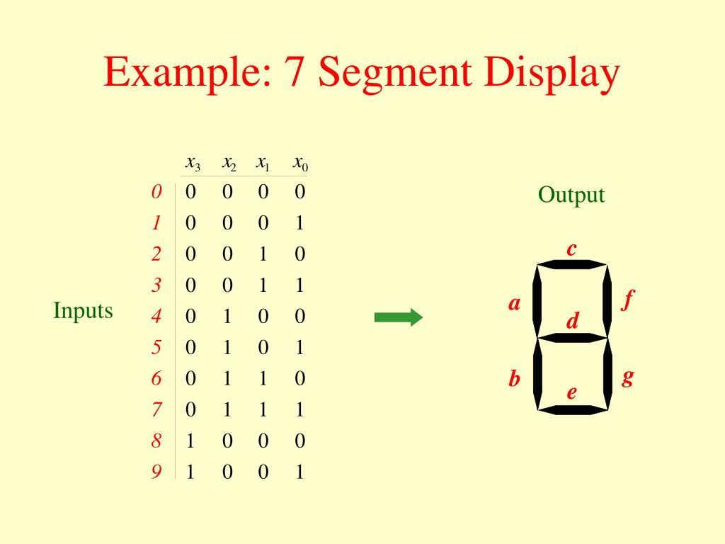 x x x x 3 2 1 0 Output 0 0 0 0 0 1 0 0 0 1 c 2 0 0 1 0 f 3 0 0 1 1 a d 4 0 1 0 0 5 0 1 0 1 g b 6 0 1 1 0 e 7 0 1 1 1 8 1 0 0 0 9 1 0 0 1 Example: 7 Segment Display Inputs