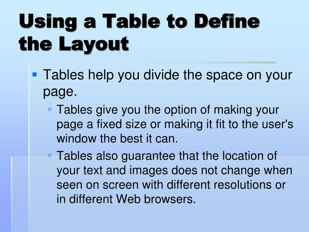 Using a Table to Define the Layout • Tables help you divide the space on your page. • Tables give you the option of making your page a fixed size or making it fit to the user's window the best it can. • Tables also guarantee that the location of your text and images does not change when seen on screen with different resolutions or in different Web browsers.