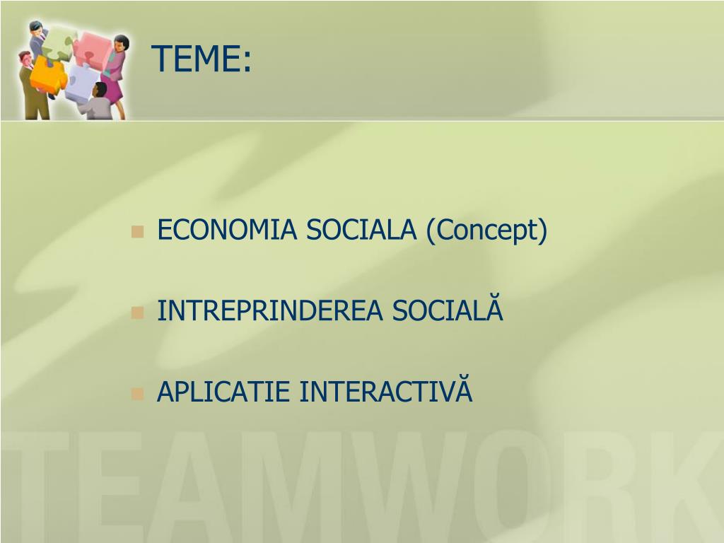 TEME: • ECONOMIA SOCIALA (Concept) • INTREPRINDEREA SOCIALĂ • APLICATIE INTERACTIVĂ