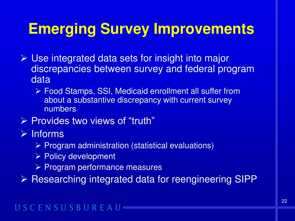 Emerging Survey Improvements • Use integrated data sets for insight into major discrepancies between survey and federal program data • Food Stamps, SSI, Medicaid enrollment all suffer from about a substantive discrepancy with current survey numbers • Provides two views of “truth” • Informs • Program administration (statistical evaluations) • Policy development • Program performance measures • Researching integrated data for reengineering SIPP