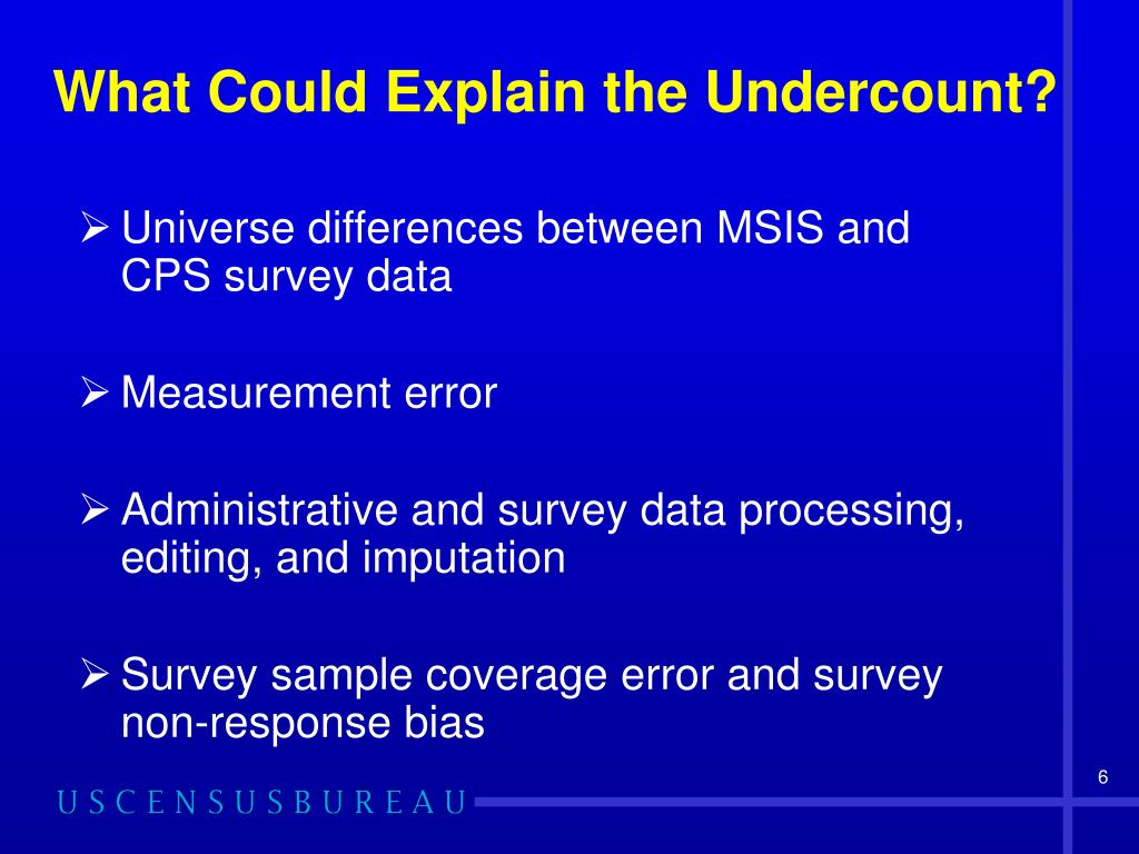 What Could Explain the Undercount? • Universe differences between MSIS and CPS survey data • Measurement error • Administrative and survey data processing, editing, and imputation • Survey sample coverage error and survey non-response bias