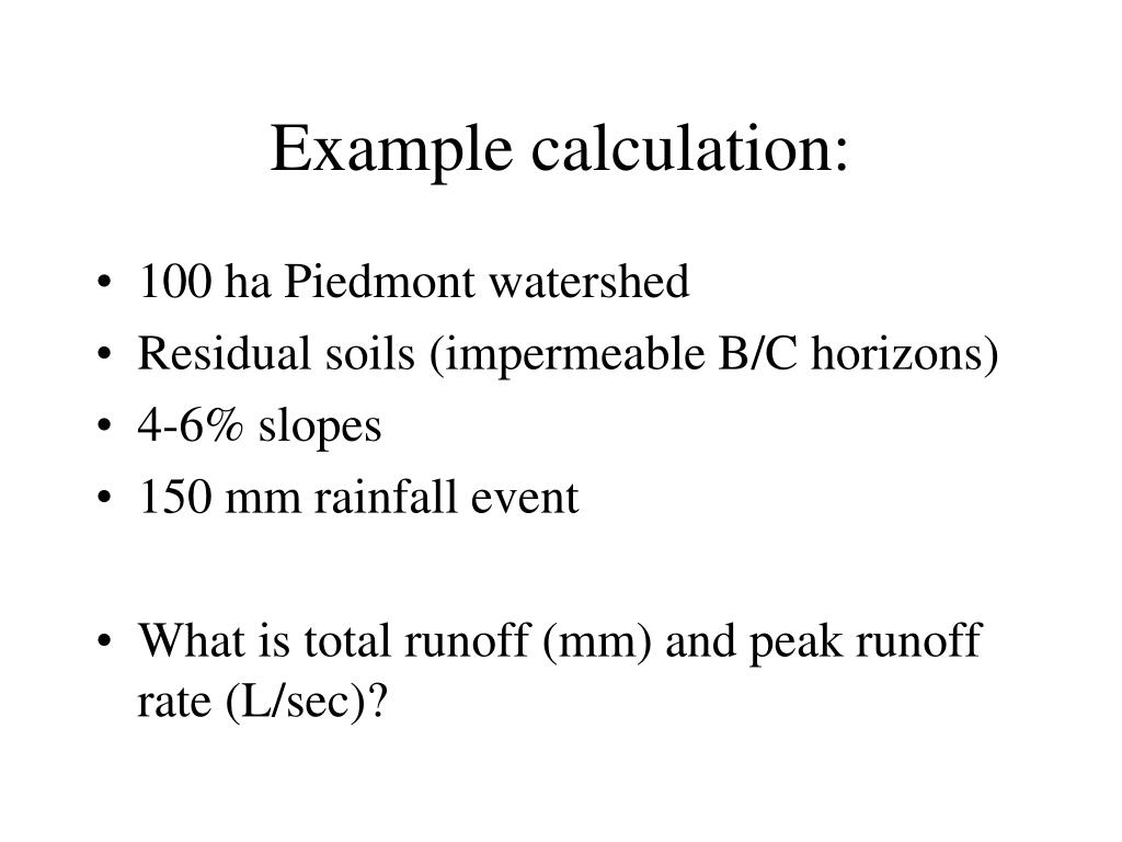 Example calculation: • 100 ha Piedmont watershed • Residual soils (impermeable B/C horizons) • 4-6% slopes • 150 mm rainfall event • What is total runoff (mm) and peak runoff rate (L/sec)?