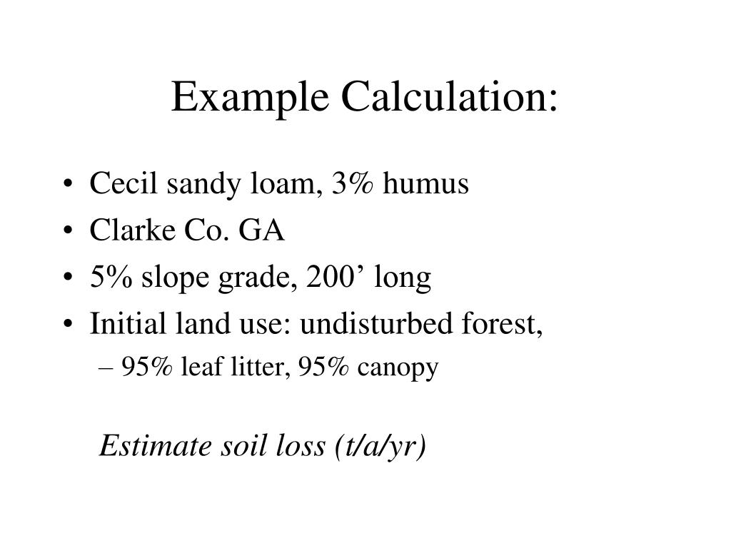 Example Calculation: • Cecil sandy loam, 3% humus • Clarke Co. GA • 5% slope grade, 200’ long • Initial land use: undisturbed forest, • 95% leaf litter, 95% canopy Estimate soil loss (t/a/yr)