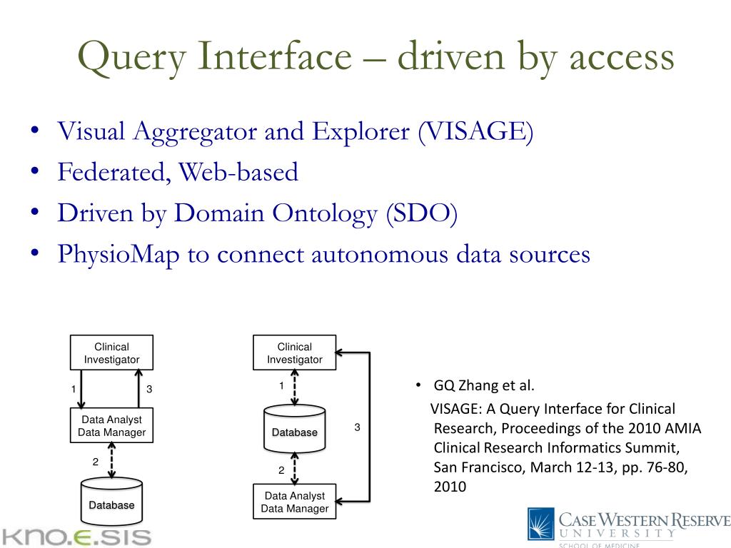 Query Interface – driven by access • Visual Aggregator and Explorer (VISAGE) • Federated, Web-based • Driven by Domain Ontology (SDO) • PhysioMap to connect autonomous data sources • GQ Zhang et al. • VISAGE: A Query Interface for Clinical Research, Proceedings of the 2010 AMIA Clinical Research Informatics Summit, San Francisco, March 12-13, pp. 76-80, 2010