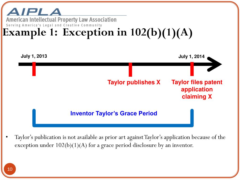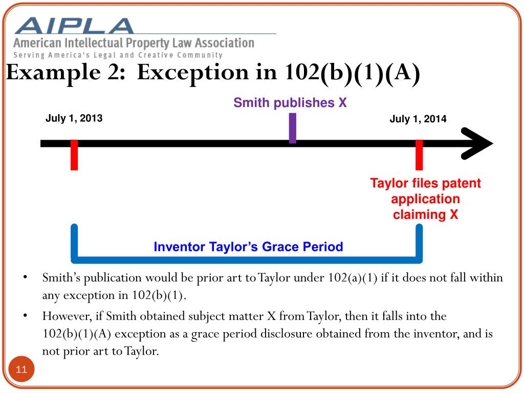 Example 1: Exception in 102(b)(1)(A) July 1, 2013 July 1, 2014 Taylor files patent application claiming X Taylor publishes X Inventor Taylor’s Grace Period • Taylor’s publication is not available as prior art against Taylor’s application because of the exception under 102(b)(1)(A) for a grace period disclosure by an inventor.