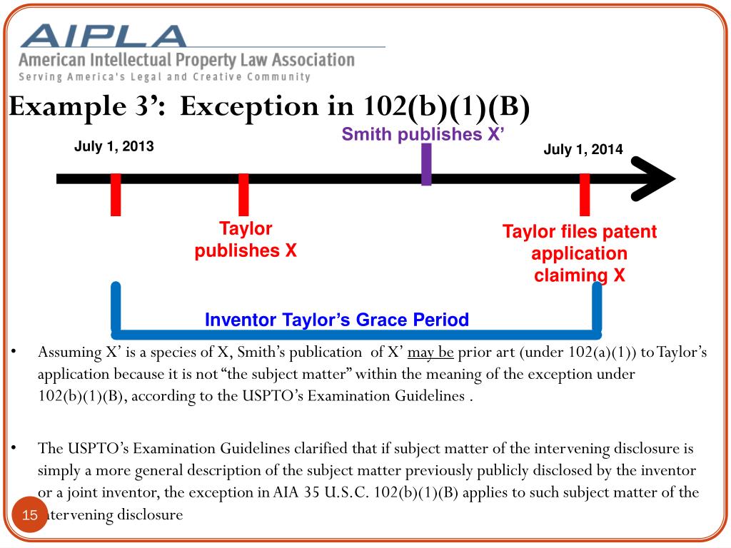 Example 3’: Exception in 102(b)(1)(B) Smith publishes X’ July 1, 2013 July 1, 2014 Taylor publishes X Taylor files patent application claiming X Inventor Taylor’s Grace Period • Assuming X’ is a species of X, Smith’s publication of X’ may beprior art (under 102(a)(1)) to Taylor’s application because it is not “the subject matter” within the meaning of the exception under 102(b)(1)(B), according to the USPTO’s Examination Guidelines . • The USPTO’s Examination Guidelines clarified that if subject matter of the intervening disclosure is simply a more general description of the subject matter previously publicly disclosed by the inventor or a joint inventor, the exception in AIA 35 U.S.C. 102(b)(1)(B) applies to such subject matter of the intervening disclosure