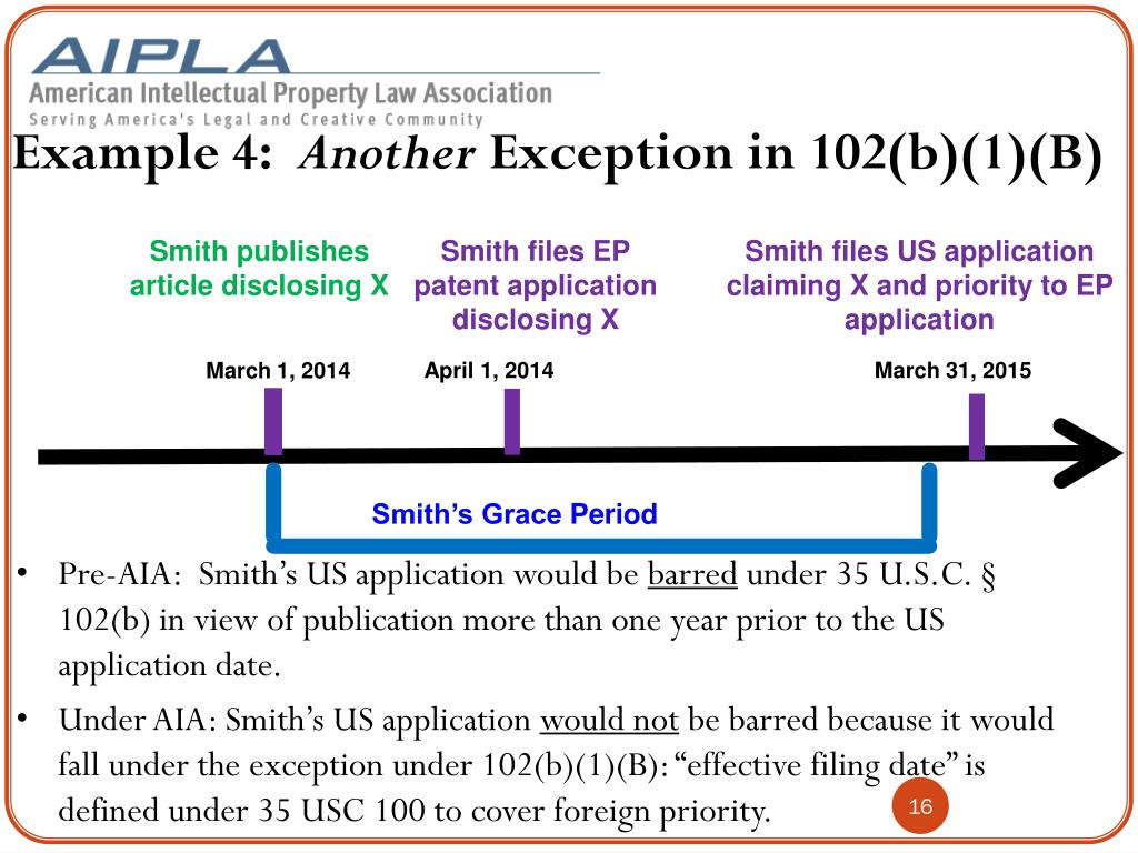 Example 4: Another Exception in 102(b)(1)(B) Smith publishes article disclosing X Smith files EPpatent application disclosing X Smith files US applicationclaiming X and priority to EP application April 1, 2014 March 31, 2015 March 1, 2014 Smith’s Grace Period • Pre-AIA: Smith’s US application would be barred under 35 U.S.C. § 102(b) in view of publication more than one year prior to the US application date. • Under AIA: Smith’s US application would not be barred because it would fall under the exception under 102(b)(1)(B): “effective filing date” is defined under 35 USC 100 to cover foreign priority.