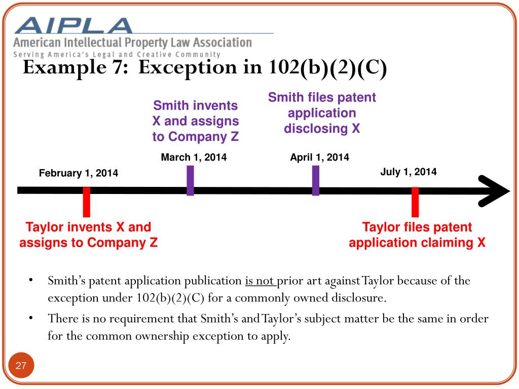Example 7: Exception in 102(b)(2)(C) Smith files patent application disclosing X Smith invents X and assigns to Company Z March 1, 2014 April 1, 2014 July 1, 2014 February 1, 2014 Taylor invents X and assigns to Company Z Taylor files patent application claiming X • Smith’s patent application publication is not prior art against Taylor because of the exception under 102(b)(2)(C) for a commonly owned disclosure. • There is no requirement that Smith’s and Taylor’s subject matter be the same in order for the common ownership exception to apply.