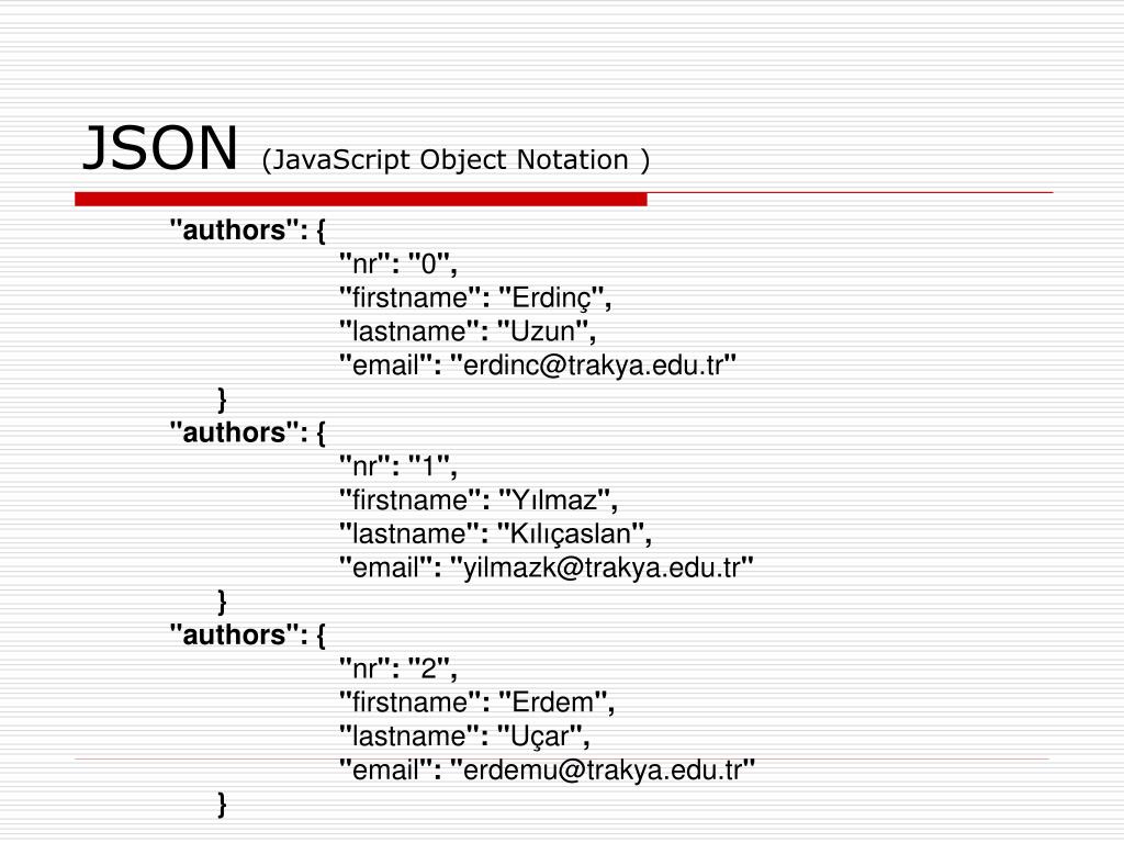 JSON (JavaScript Object Notation ) "authors": { "nr": "0", "firstname": "Erdinç", "lastname": "Uzun", "email": "erdinc@trakya.edu.tr" } "authors": { "nr": "1", "firstname": "Yılmaz", "lastname": "Kılıçaslan", "email": "yilmazk@trakya.edu.tr" } "authors": { "nr": "2", "firstname": "Erdem", "lastname": "Uçar", "email": "erdemu@trakya.edu.tr" }