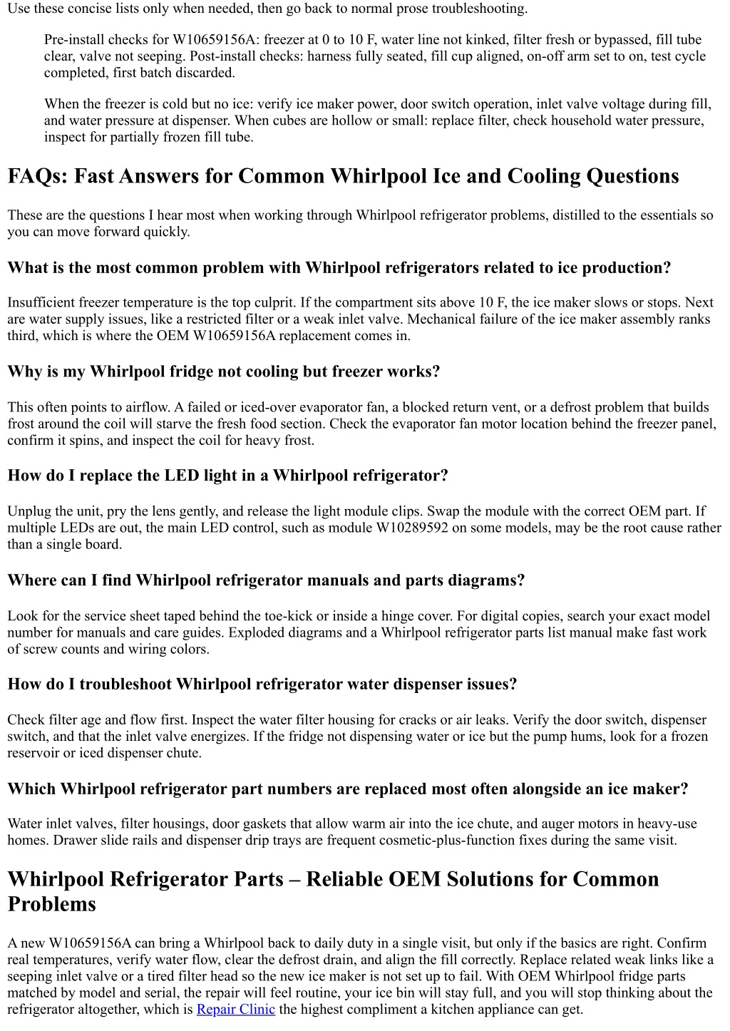 Use these concise lists only when needed, then go back to normal prose troubleshooting. Pre-install checks for W10659156A: freezer at 0 to 10 F, water line not kinked, filter fresh or bypassed, fill tube clear, valve not seeping. Post-install checks: harness fully seated, fill cup aligned, on-off arm set to on, test cycle completed, first batch discarded. When the freezer is cold but no ice: verify ice maker power, door switch operation, inlet valve voltage during fill, and water pressure at dispenser. When cubes are hollow or small: replace filter, check household water pressure, inspect for partially frozen fill tube. FAQs: Fast Answers for Common Whirlpool Ice and Cooling Questions These are the questions I hear most when working through Whirlpool refrigerator problems, distilled to the essentials so you can move forward quickly. What is the most common problem with Whirlpool refrigerators related to ice production? Insufficient freezer temperature is the top culprit. If the compartment sits above 10 F, the ice maker slows or stops. Next are water supply issues, like a restricted filter or a weak inlet valve. Mechanical failure of the ice maker assembly ranks third, which is where the OEM W10659156A replacement comes in. Why is my Whirlpool fridge not cooling but freezer works? This often points to airflow. A failed or iced-over evaporator fan, a blocked return vent, or a defrost problem that builds frost around the coil will starve the fresh food section. Check the evaporator fan motor location behind the freezer panel, confirm it spins, and inspect the coil for heavy frost. How do I replace the LED light in a Whirlpool refrigerator? Unplug the unit, pry the lens gently, and release the light module clips. Swap the module with the correct OEM part. If multiple LEDs are out, the main LED control, such as module W10289592 on some models, may be the root cause rather than a single board. Where can I find Whirlpool refrigerator manuals and parts diagrams? Look for the service sheet taped behind the toe-kick or inside a hinge cover. For digital copies, search your exact model number for manuals and care guides. Exploded diagrams and a Whirlpool refrigerator parts list manual make fast work of screw counts and wiring colors. How do I troubleshoot Whirlpool refrigerator water dispenser issues? Check filter age and flow first. Inspect the water filter housing for cracks or air leaks. Verify the door switch, dispenser switch, and that the inlet valve energizes. If the fridge not dispensing water or ice but the pump hums, look for a frozen reservoir or iced dispenser chute. Which Whirlpool refrigerator part numbers are replaced most often alongside an ice maker? Water inlet valves, filter housings, door gaskets that allow warm air into the ice chute, and auger motors in heavy-use homes. Drawer slide rails and dispenser drip trays are frequent cosmetic-plus-function fixes during the same visit. Whirlpool Refrigerator Parts – Reliable OEM Solutions for Common Problems A new W10659156A can bring a Whirlpool back to daily duty in a single visit, but only if the basics are right. Confirm real temperatures, verify water flow, clear the defrost drain, and align the fill correctly. Replace related weak links like a seeping inlet valve or a tired filter head so the new ice maker is not set up to fail. With OEM Whirlpool fridge parts matched by model and serial, the repair will feel routine, your ice bin will stay full, and you will stop thinking about the refrigerator altogether, which is Repair Clinic the highest compliment a kitchen appliance can get.