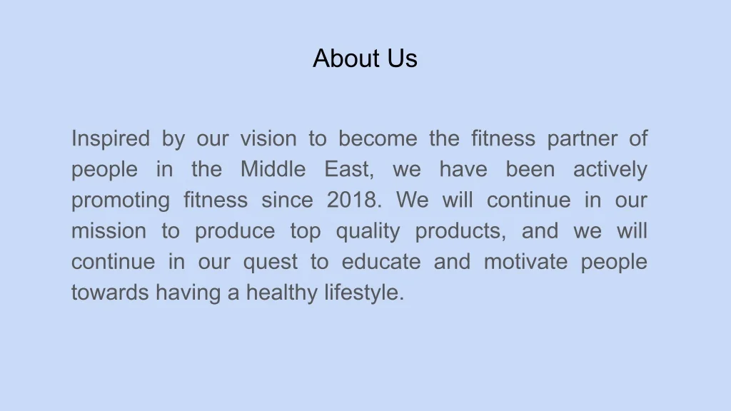 About Us Inspired by our vision to become the fitness partner of people in the Middle East, we have been actively promoting fitness since 2018. We will continue in our mission to produce top quality products, and we will continue in our quest to educate and motivate people towards having a healthy lifestyle.