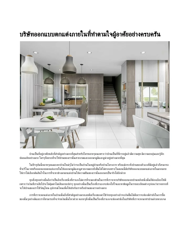 บริษัทออกแบบตกแต่งภายในที่ทําตามใจผู้อาศัยอย่างครบครันบริษัทออกแบบตกแต่งภายในที่ทําตามใจผู้อาศัยอย่างครบครัน บ้านเป็นที่อยู่อาศัยหลักที่สําคัญอย่างมากที่สุดสําหรับใครหลายๆคนเพราะว่าบ้านเป็นที่ที่เราอยู่แล้วมีความสุขมีความอบอุ่นและรู้สึก ปลอดภัยอย่างมากใครๆก็อยากที่จะให้บ้านของเรานั้นสวยงามและออกมาดูดีและดูน่าอยู่อย่างมากที่สุด ในป ั จจุบันนี้หลายๆคนมองหาบ้านใหม่ๆไม่ว่าจะเป็นบ้านในหมู่บ้านหรือบ้านโครงการหรือแม้กระทั่งบ้านของตัวเองที่มีอยู่แล้วก็สามารถ ที่จะรีโนเวทหรือออกแบบตกแต่งภายในให้ออกมาดูดีและดูสวยงามมากยิ่งขึ้นได้ไม่ยากเพราะในตอนนี้มีบริษัทออกแบบตกแต่งภายในมากมาย ให้เราได้เลือกตัดสินใจในการที่จะหาช่างมาตกแต่งบ้านให้ความฝ ั นของเรานั้นออกมาเป็นจริงได้อีกด้วย ทุกสิ่งทุกอย่างนั้นถือว่าเป็นอีกเรื่องหนึ่งที่เราเองไม่ควรที่จะมองข้ามในการที่เราจะหาบริษัทออกแบบบ้านหลังหนึ่งนั้นก็ต้องเลือกให้ดี เพราะว่าเงินที่เราเสียไปจะได้คุ้มค่าไม่เสียดายเปล่าๆทุกอย่างนั้นเป็นเรื่องที่เราเองจะต้องใส่ใจและหาข้อมูลในรายละเอียดต่างๆก่อนว่าเราอยากที่ จะให้บ้านของเราใช้วัสดุไหนอุปกรณ์ไหนเพื่อให้เข้ากับเราหรือบ้านของเราอย่างมาก การที่เราจะตกแต่งภายในบ้านนั้นสิ่งที่สําคัญอย่างมากเลยคือเรื่องของค่าใช้จ่ายทุกอย่างถ้าจะเกิดขึ้นได้คือเราจะต้องมีกําลังในการซื้อ ของนั้นๆอย่างดีและเราก็สามารถที่จะจ่ายเงินนั้นไหวด้วยหลายๆสิ่งนั้นเป็นเรื่องที่เราเองจะต้องคํานึงในบริษัทที่เราจะหามาทําบ้านด้วยหากเจอ