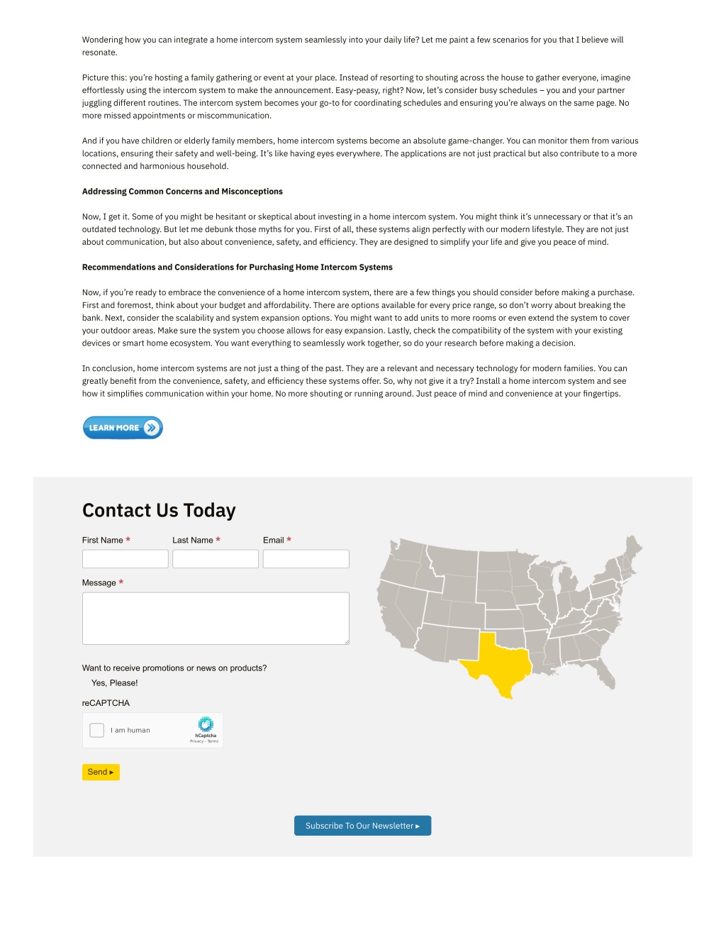Wonderinghowyoucanintegrateahomeintercomsystemseamlesslyintoyourdailylife?LetmepaintafewscenariosforyouthatIbelievewillWonderinghowyoucanintegrateahomeintercomsystemseamlesslyintoyourdailylife?LetmepaintafewscenariosforyouthatIbelievewill resonate. Picturethis:you’rehostingafamilygatheringoreventatyourplace.Insteadofresortingtoshoutingacrossthehousetogathereveryone,imagine effortlesslyusingtheintercomsystemtomaketheannouncement.Easy-peasy,right?Now,let’sconsiderbusyschedules–youandyourpartner jugglingdifferentroutines.Theintercomsystembecomesyourgo-toforcoordinatingschedulesandensuringyou’realwaysonthesamepage.No moremissedappointmentsormiscommunication. Andifyouhavechildrenorelderlyfamilymembers,homeintercomsystemsbecomeanabsolutegame-changer.Youcanmonitorthemfromvarious locations,ensuringtheirsafetyandwell-being.It’slikehavingeyeseverywhere.Theapplicationsarenotjustpracticalbutalsocontributetoamore connectedandharmonioushousehold. AddressingCommonConcernsandMisconceptions Now,Igetit.Someofyoumightbehesitantorskepticalaboutinvestinginahomeintercomsystem.Youmightthinkit’sunnecessaryorthatit’san outdatedtechnology.Butletmedebunkthosemythsforyou.Firstofall,thesesystemsalignperfectlywithourmodernlifestyle.Theyarenotjust aboutcommunication,butalsoaboutconvenience,safety,andef?ciency.Theyaredesignedtosimplifyyourlifeandgiveyoupeaceofmind. RecommendationsandConsiderationsforPurchasingHomeIntercomSystems Now,ifyou’rereadytoembracetheconvenienceofahomeintercomsystem,thereareafewthingsyoushouldconsiderbeforemakingapurchase. Firstandforemost,thinkaboutyourbudgetandaffordability.Thereareoptionsavailableforeverypricerange,sodon’tworryaboutbreakingthe bank.Next,considerthescalabilityandsystemexpansionoptions.Youmightwanttoaddunitstomoreroomsorevenextendthesystemtocover youroutdoorareas.Makesurethesystemyouchooseallowsforeasyexpansion.Lastly,checkthecompatibilityofthesystemwithyourexisting devicesorsmarthomeecosystem.Youwanteverythingtoseamlesslyworktogether,sodoyourresearchbeforemakingadecision. Inconclusion,homeintercomsystemsarenotjustathingofthepast.Theyarearelevantandnecessarytechnologyformodernfamilies.Youcan greatlybene?tfromtheconvenience,safety,andef?ciencythesesystemsoffer.So,whynotgiveitatry?Installahomeintercomsystemandsee howitsimpli?escommunicationwithinyourhome.Nomoreshoutingorrunningaround.Justpeaceofmindandconvenienceatyour?ngertips. ContactUsToday First Name * Last Name * Email * Message * Want to receive promotions or news on products? Yes, Please! reCAPTCHA I am human Privacy - Terms Send ▸ SubscribeToOurNewsletter▸