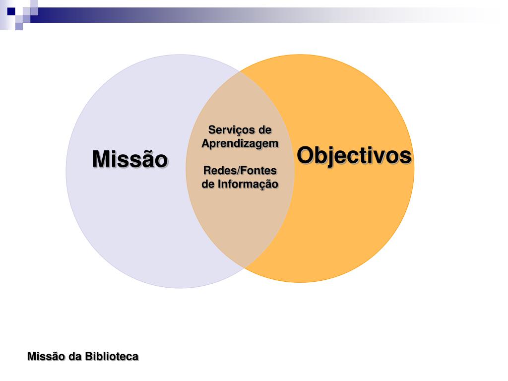 Serviços de Aprendizagem Redes/Fontes de Informação Objectivos Missão Missão da Biblioteca