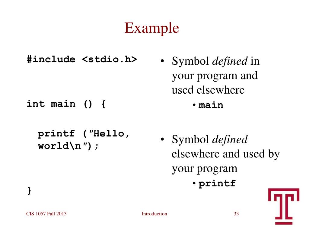 Example #include <stdio.h> int main () { printf (″Hello, world\n″); } Symbol defined in your program and used elsewhere main Symbol defined elsewhere and used by your program printf Introduction