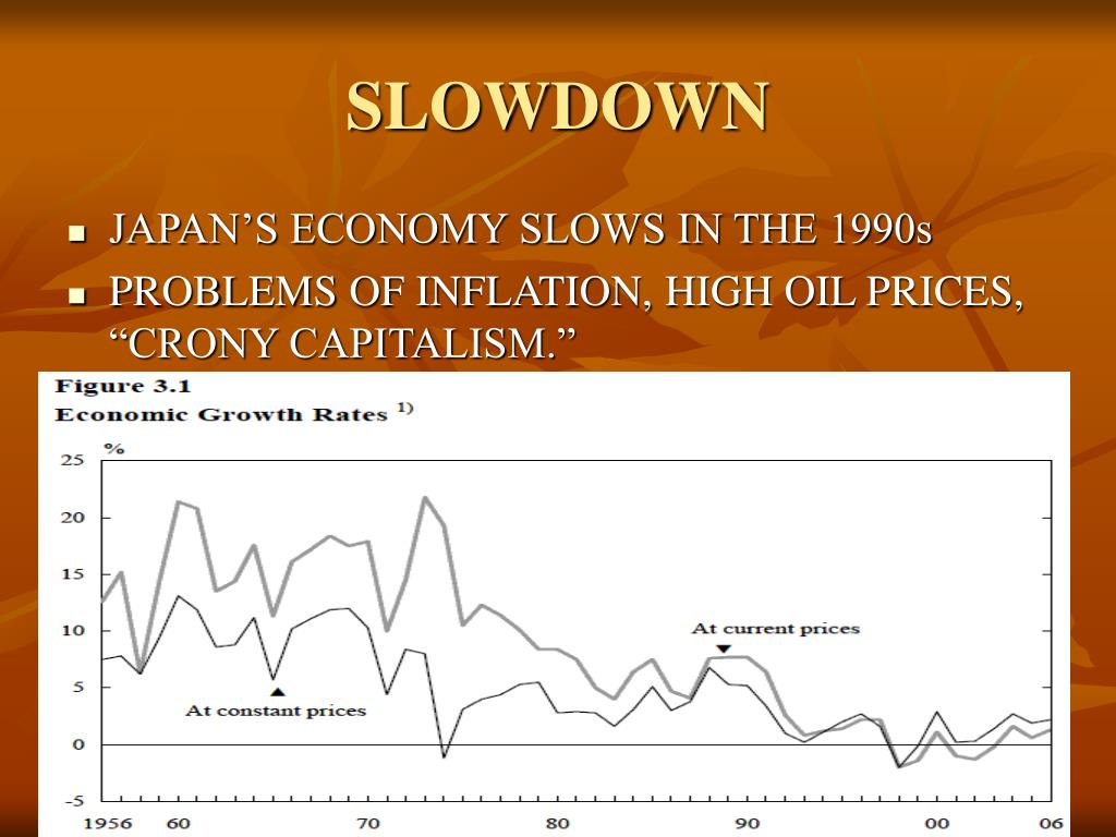 SLOWDOWN • JAPAN’S ECONOMY SLOWS IN THE 1990s • PROBLEMS OF INFLATION, HIGH OIL PRICES, “CRONY CAPITALISM.”