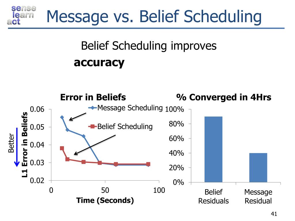 Message vs. Belief Scheduling Belief Scheduling improves accuracy and convergence Better
