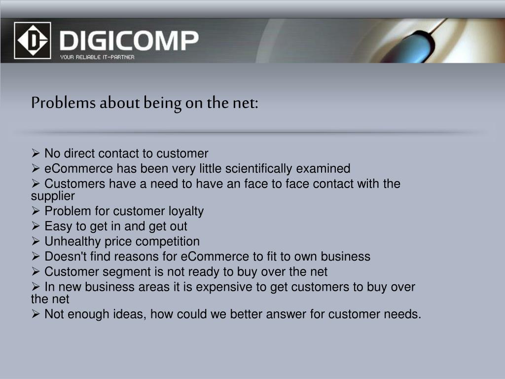 Problems about being on the net: No direct contact to customer eCommerce has been very little scientifically examined Customers have a need to have an face to face contact with the supplier Problem for customer loyalty Easy to get in and get out Unhealthy price competition Doesn't find reasons for eCommerce to fit to own business Customer segment is not ready to buy over the net In new business areas it is expensive to get customers to buy over the net Not enough ideas, how could we better answer for customer needs.