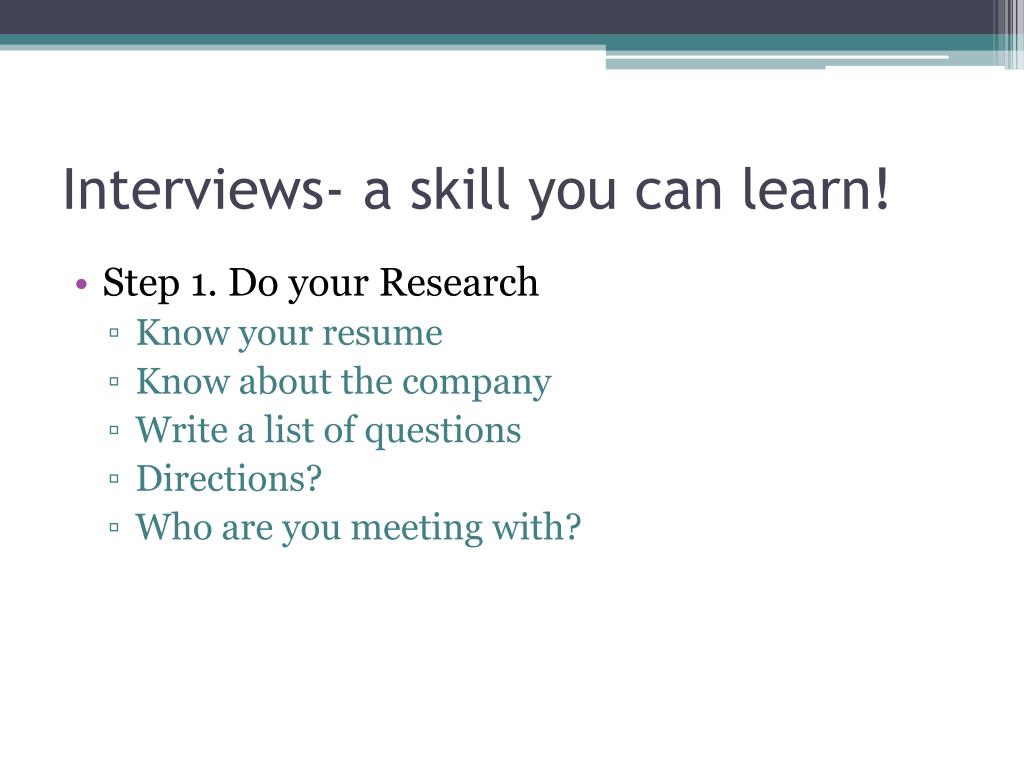 Interviews- a skill you can learn! • Step 1. Do your Research • Know your resume • Know about the company • Write a list of questions • Directions? • Who are you meeting with?