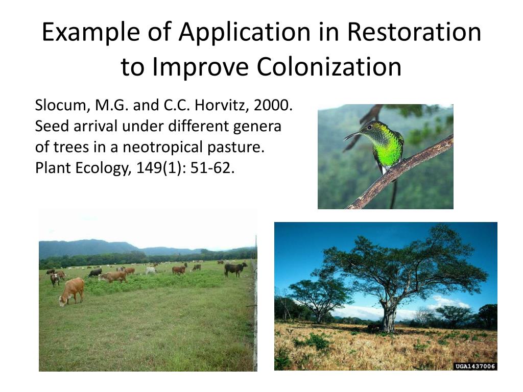 Example of Application in Restoration to Improve Colonization Slocum, M.G. and C.C. Horvitz, 2000. Seed arrival under different genera of trees in a neotropical pasture. Plant Ecology, 149(1): 51-62.
