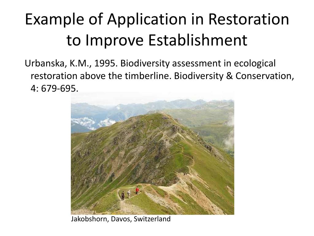 Example of Application in Restoration to Improve Establishment Urbanska, K.M., 1995. Biodiversity assessment in ecological restoration above the timberline. Biodiversity & Conservation, 4: 679-695. Jakobshorn, Davos, Switzerland