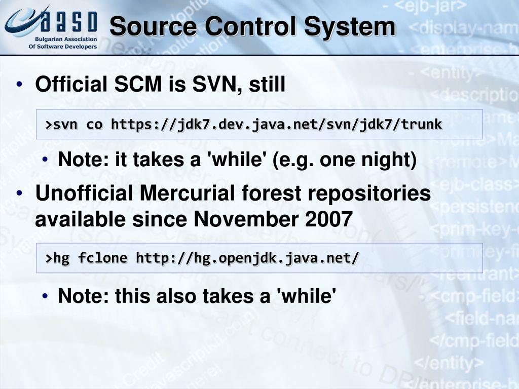 Source Control System Official SCM is SVN, still Note: it takes a 'while' (e.g. one night) Unofficial Mercurial forest repositories available since November 2007 Note: this also takes a 'while' >svn co https://jdk7.dev.java.net/svn/jdk7/trunk >hg fclone http://hg.openjdk.java.net/