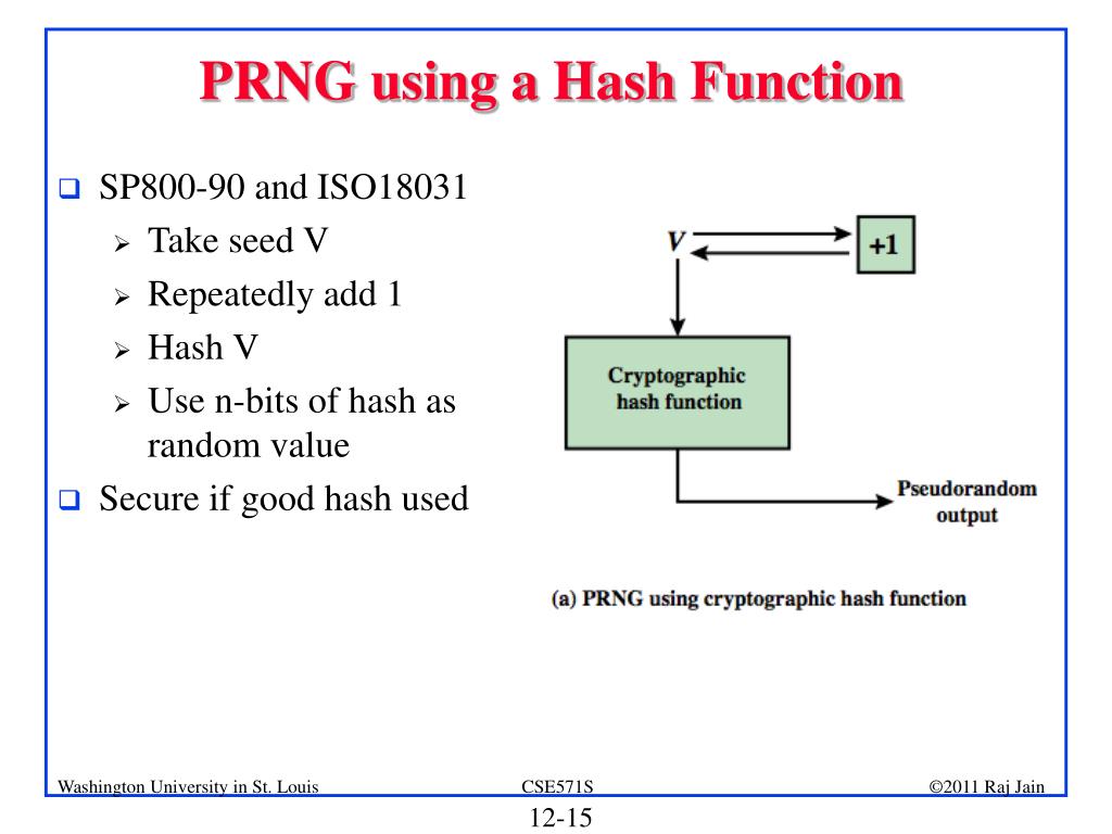 PRNG using a Hash Function SP800-90 and ISO18031 Take seed V Repeatedly add 1 Hash V Use n-bits of hash as random value Secure if good hash used