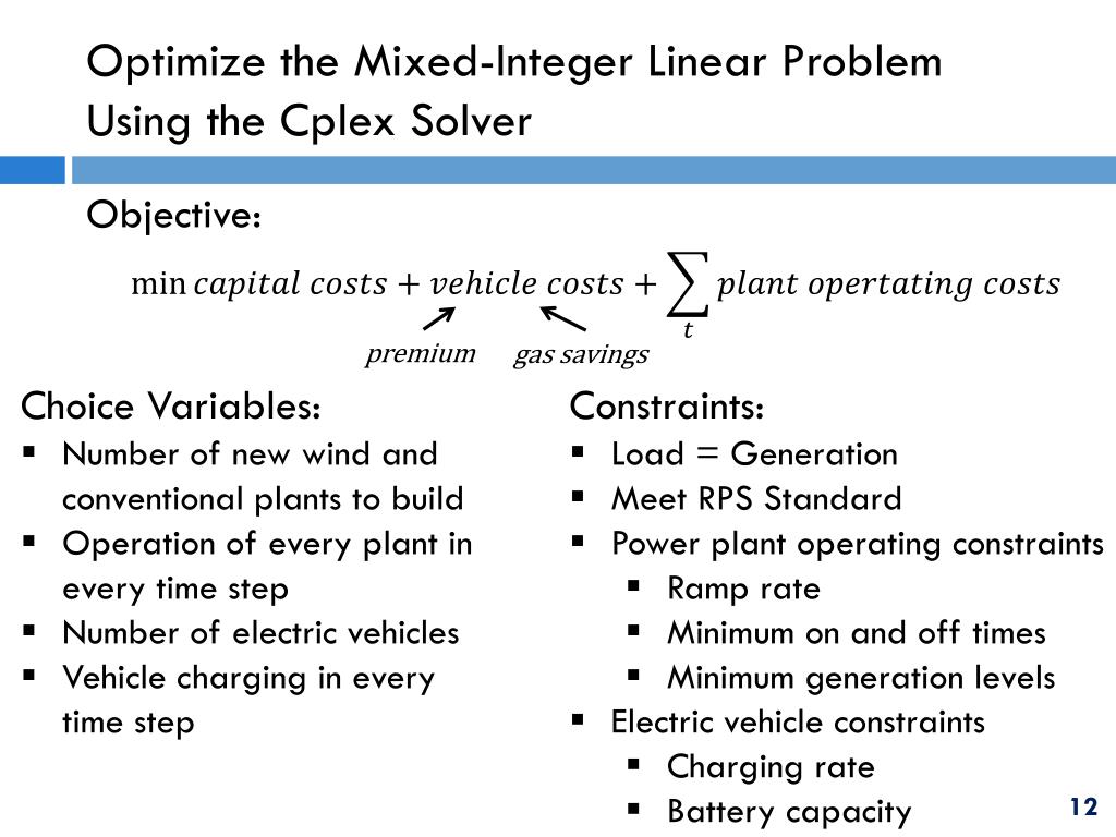 Optimize the Mixed-Integer Linear Problem Using the Cplex Solver Objective: premium gas savings • Choice Variables: • Number of new wind and conventional plants to build • Operation of every plant in every time step • Number of electric vehicles • Vehicle charging in every time step • Constraints: • Load = Generation • Meet RPS Standard • Power plant operating constraints • Ramp rate • Minimum on and off times • Minimum generation levels • Electric vehicle constraints • Charging rate • Battery capacity