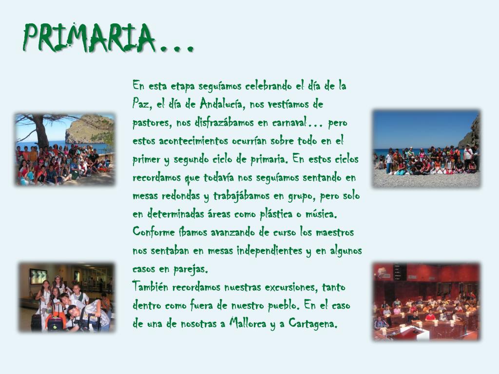 PRIMARIA… En esta etapa seguíamos celebrando el día de la Paz, el día de Andalucía, nos vestíamos de pastores, nos disfrazábamos en carnaval… pero estos acontecimientos ocurrían sobre todo en el primer y segundo ciclo de primaria. En estos ciclos recordamos que todavía nos seguíamos sentando en mesas redondas y trabajábamos en grupo, pero solo en determinadas áreas como plástica o música. Conforme íbamos avanzando de curso los maestros nos sentaban en mesas independientes y en algunos casos en parejas. También recordamos nuestras excursiones, tanto dentro como fuera de nuestro pueblo. En el caso de una de nosotras a Mallorca y a Cartagena.