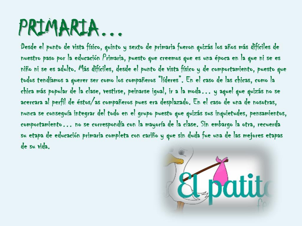 PRIMARIA… Desde el punto de vista físico, quinto y sexto de primaria fueron quizás los años más difíciles de nuestro paso por la educación Primaria, puesto que creemos que es una época en la que ni se es niño ni se es adulto. Más difíciles, desde el punto de vista físico y de comportamiento, puesto que todos tendíamos a querer ser como los compañeros “líderes”. En el caso de las chicas, como la chica más popular de la clase, vestirse, peinarse igual, ir a la moda… y aquel que quizás no se acercara al perfil de éstos/as compañeros pues era desplazado. En el caso de una de nosotras, nunca se conseguía integrar del todo en el grupo puesto que quizás sus inquietudes, pensamientos, comportamiento… no se correspondía con la mayoría de la clase. Sin embargo la otra, recuerda su etapa de educación primaria completa con cariño y que sin duda fue una de las mejores etapas de su vida.