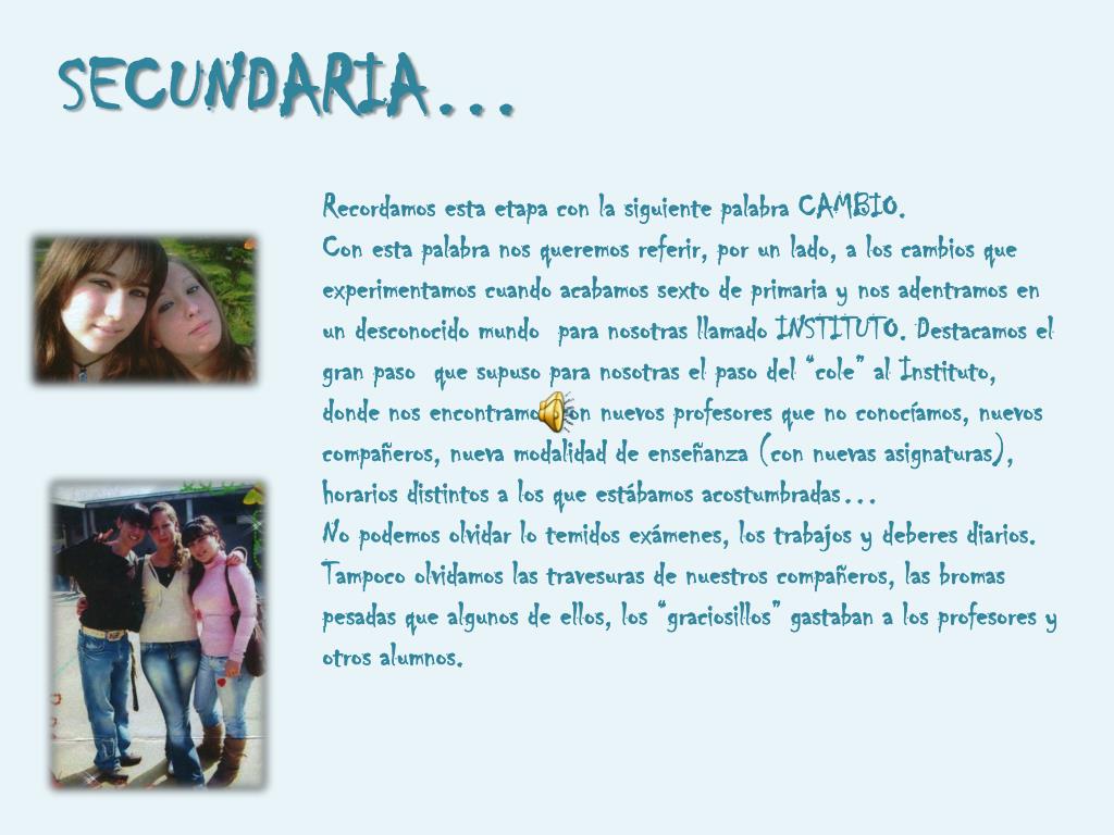 SECUNDARIA… Recordamos esta etapa con la siguiente palabra CAMBIO. Con esta palabra nos queremos referir, por un lado, a los cambios que experimentamos cuando acabamos sexto de primaria y nos adentramos en un desconocido mundo para nosotras llamado INSTITUTO. Destacamos el gran paso que supuso para nosotras el paso del “cole” al Instituto, donde nos encontramos con nuevos profesores que no conocíamos, nuevos compañeros, nueva modalidad de enseñanza (con nuevas asignaturas), horarios distintos a los que estábamos acostumbradas… No podemos olvidar lo temidos exámenes, los trabajos y deberes diarios. Tampoco olvidamos las travesuras de nuestros compañeros, las bromas pesadas que algunos de ellos, los “graciosillos” gastaban a los profesores y otros alumnos.