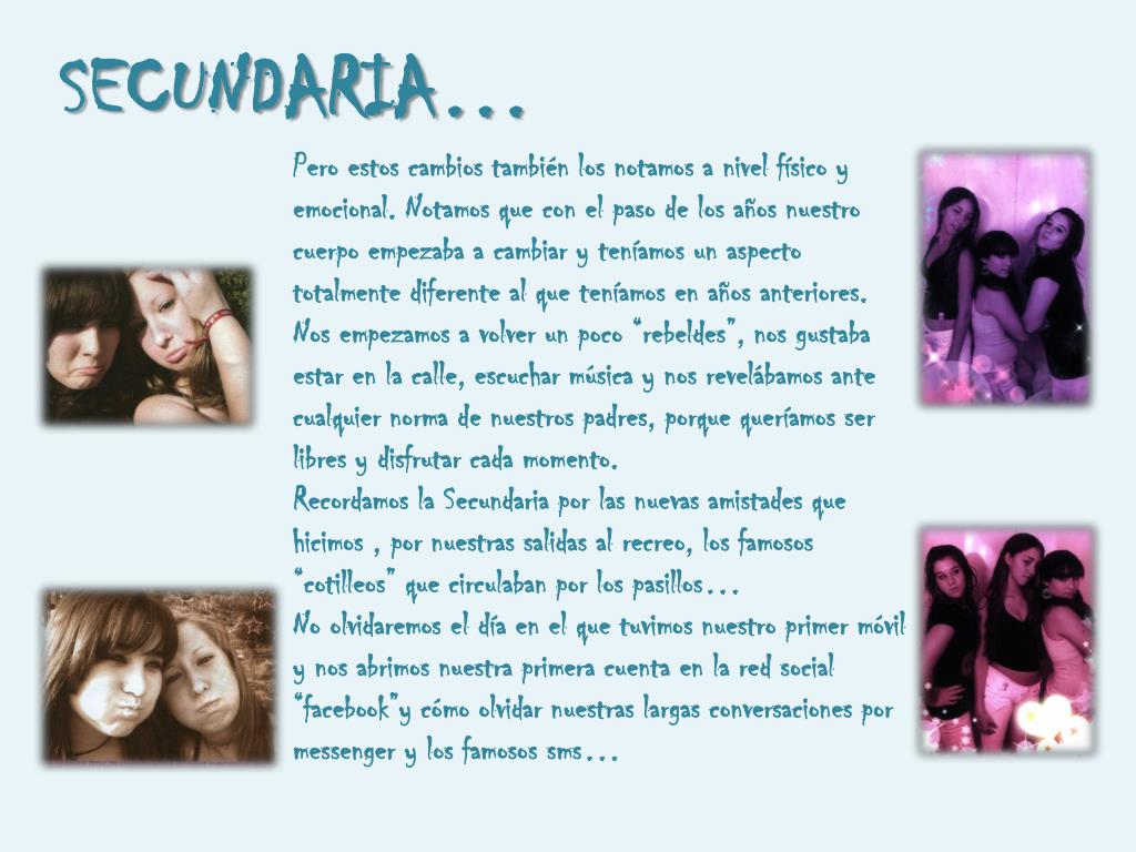 SECUNDARIA… Pero estos cambios también los notamos a nivel físico y emocional. Notamos que con el paso de los años nuestro cuerpo empezaba a cambiar y teníamos un aspecto totalmente diferente al que teníamos en años anteriores. Nos empezamos a volver un poco “rebeldes”, nos gustaba estar en la calle, escuchar música y nos revelábamos ante cualquier norma de nuestros padres, porque queríamos ser libres y disfrutar cada momento. Recordamos la Secundaria por las nuevas amistades que hicimos , por nuestras salidas al recreo, los famosos “cotilleos” que circulaban por los pasillos… No olvidaremos el día en el que tuvimos nuestro primer móvil y nos abrimos nuestra primera cuenta en la red social “facebook”y cómo olvidar nuestras largas conversaciones por messenger y los famosos sms…