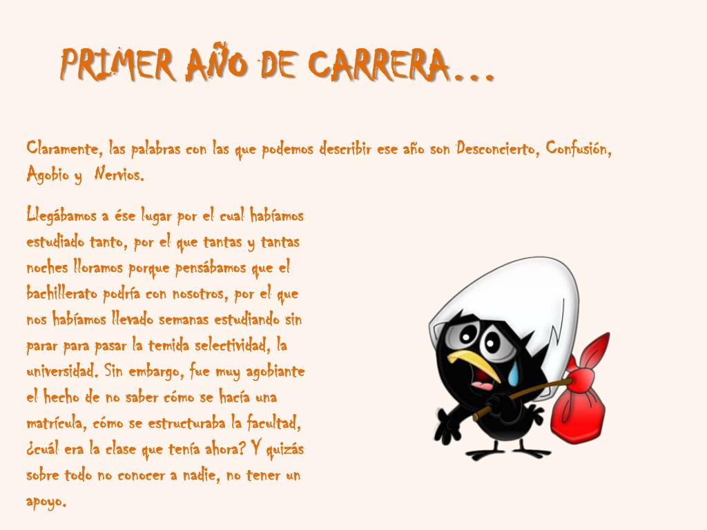 PRIMER AÑO DE CARRERA… Claramente, las palabras con las que podemos describir ese año son Desconcierto, Confusión, Agobio y Nervios. Llegábamos a ése lugar por el cual habíamos estudiado tanto, por el que tantas y tantas noches lloramos porque pensábamos que el bachillerato podría con nosotros, por el que nos habíamos llevado semanas estudiando sin parar para pasar la temida selectividad, la universidad. Sin embargo, fue muy agobiante el hecho de no saber cómo se hacía una matrícula, cómo se estructuraba la facultad, ¿cuál era la clase que tenía ahora? Y quizás sobre todo no conocer a nadie, no tener un apoyo.