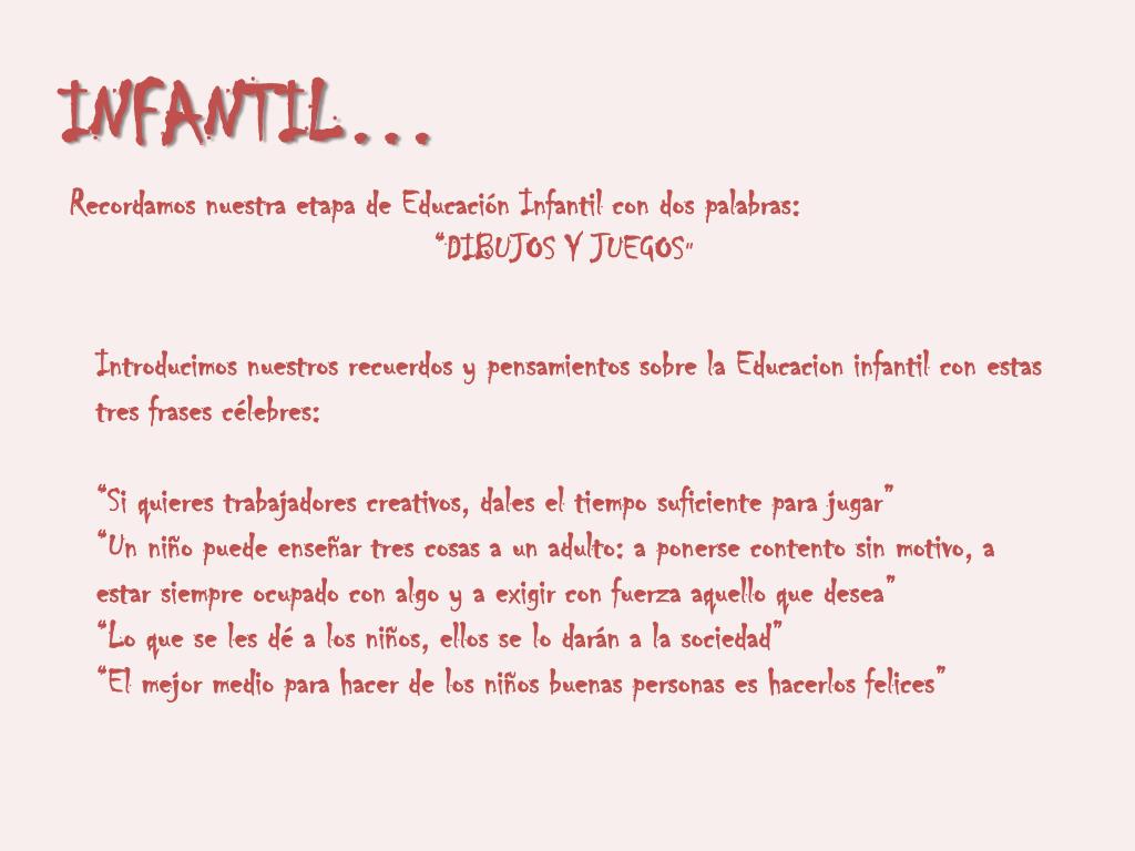 INFANTIL… Recordamos nuestra etapa de Educación Infantil con dos palabras: “DIBUJOS Y JUEGOS” Introducimos nuestros recuerdos y pensamientos sobre la Educacion infantil con estas tres frases célebres: “Si quieres trabajadores creativos, dales el tiempo suficiente para jugar” “Un niño puede enseñar tres cosas a un adulto: a ponerse contento sin motivo, a estar siempre ocupado con algo y a exigir con fuerza aquello que desea” “Lo que se les dé a los niños, ellos se lo darán a la sociedad” “El mejor medio para hacer de los niños buenas personas es hacerlos felices”