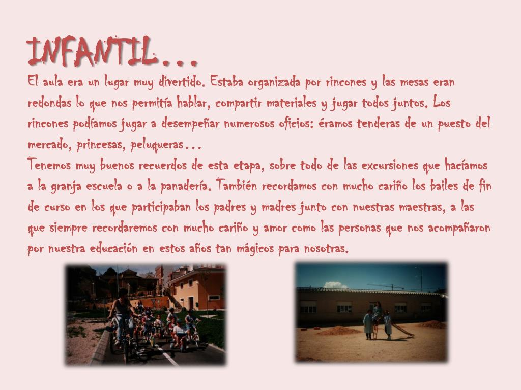 INFANTIL… El aula era un lugar muy divertido. Estaba organizada por rincones y las mesas eran redondas lo que nos permitía hablar, compartir materiales y jugar todos juntos. Los rincones podíamos jugar a desempeñar numerosos oficios: éramos tenderas de un puesto del mercado, princesas, peluqueras… Tenemos muy buenos recuerdos de esta etapa, sobre todo de las excursiones que hacíamos a la granja escuela o a la panadería. También recordamos con mucho cariño los bailes de fin de curso en los que participaban los padres y madres junto con nuestras maestras, a las que siempre recordaremos con mucho cariño y amor como las personas que nos acompañaron por nuestra educación en estos años tan mágicos para nosotras.
