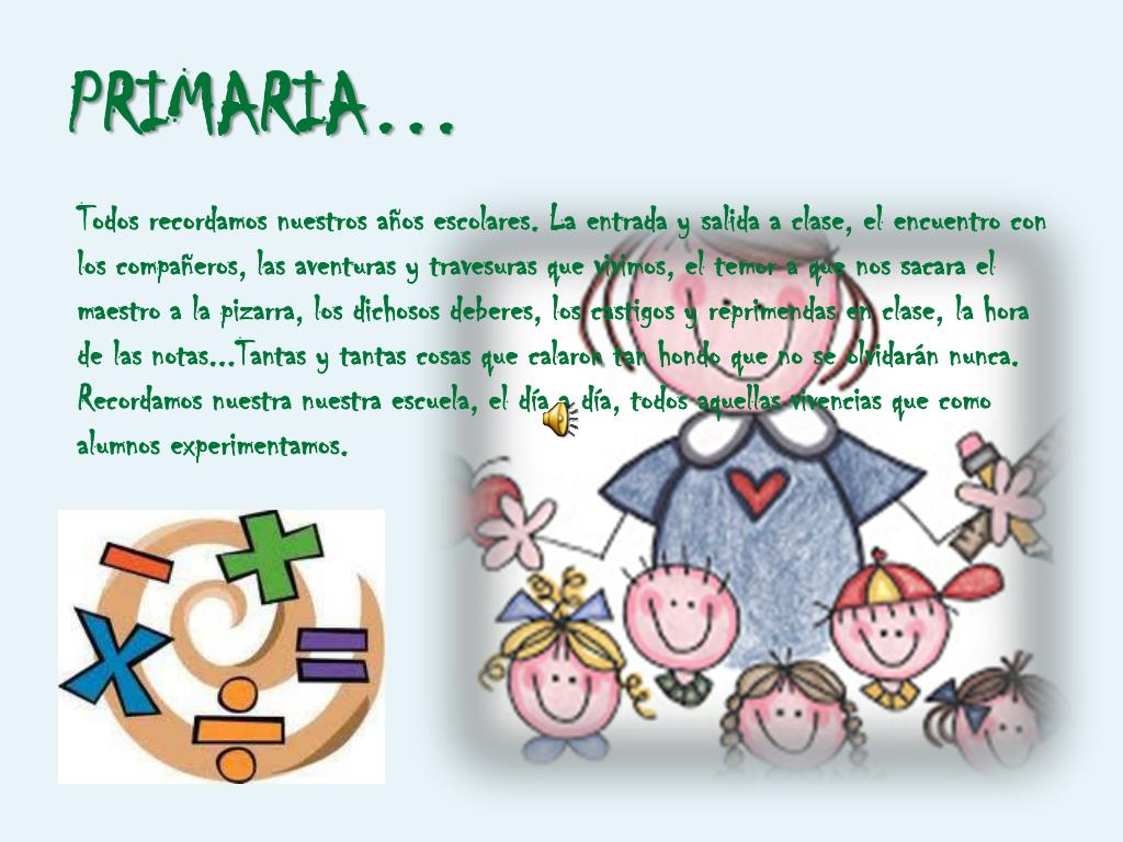 PRIMARIA… Todos recordamos nuestros años escolares. La entrada y salida a clase, el encuentro con los compañeros, las aventuras y travesuras que vivimos, el temor a que nos sacara el maestro a la pizarra, los dichosos deberes, los castigos y reprimendas en clase, la hora de las notas...Tantas y tantas cosas que calaron tan hondo que no se olvidarán nunca. Recordamos nuestra nuestra escuela, el día a día, todos aquellas vivencias que como alumnos experimentamos.