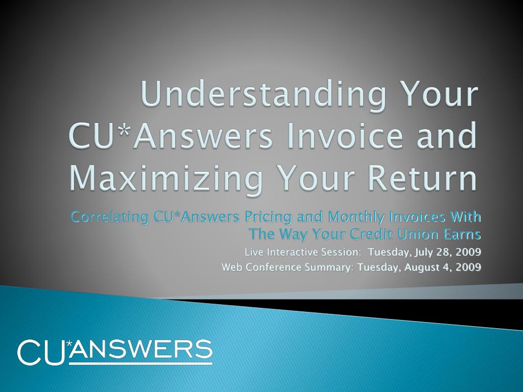 Understanding Your CU*Answers Invoice and Maximizing Your Return. Correlating CU*Answers Pricing and Monthly Invoices With The Way Your Credit Union Earns Live Interactive Session: Tuesday, July 28, 2009 Web Conference Summary: Tuesday, August 4, 2009. Introduction.