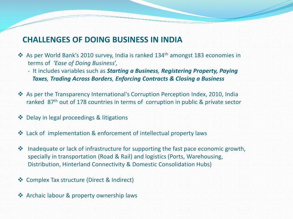 CHALLENGES OF DOING BUSINESS IN INDIA • As per World Bank’s 2010 survey, India is ranked 134th amongst 183 economies in • terms of ‘Ease of Doing Business’, • - It includes variables such as Starting a Business, Registering Property,Paying • Taxes, Trading Across Borders, Enforcing Contracts & Closing a Business • As per the Transparency International's Corruption Perception Index, 2010, India • ranked 87th out of 178 countries in terms of corruption in public & private sector • Delay in legal proceedings & litigations • Lack of implementation & enforcement of intellectual property laws • Inadequate or lack of infrastructure for supporting the fast pace economic growth, • specially in transportation (Road & Rail) and logistics (Ports, Warehousing, • Distribution, Hinterland Connectivity & Domestic Consolidation Hubs) • Complex Tax structure (Direct & Indirect) • Archaic labour & property ownership laws