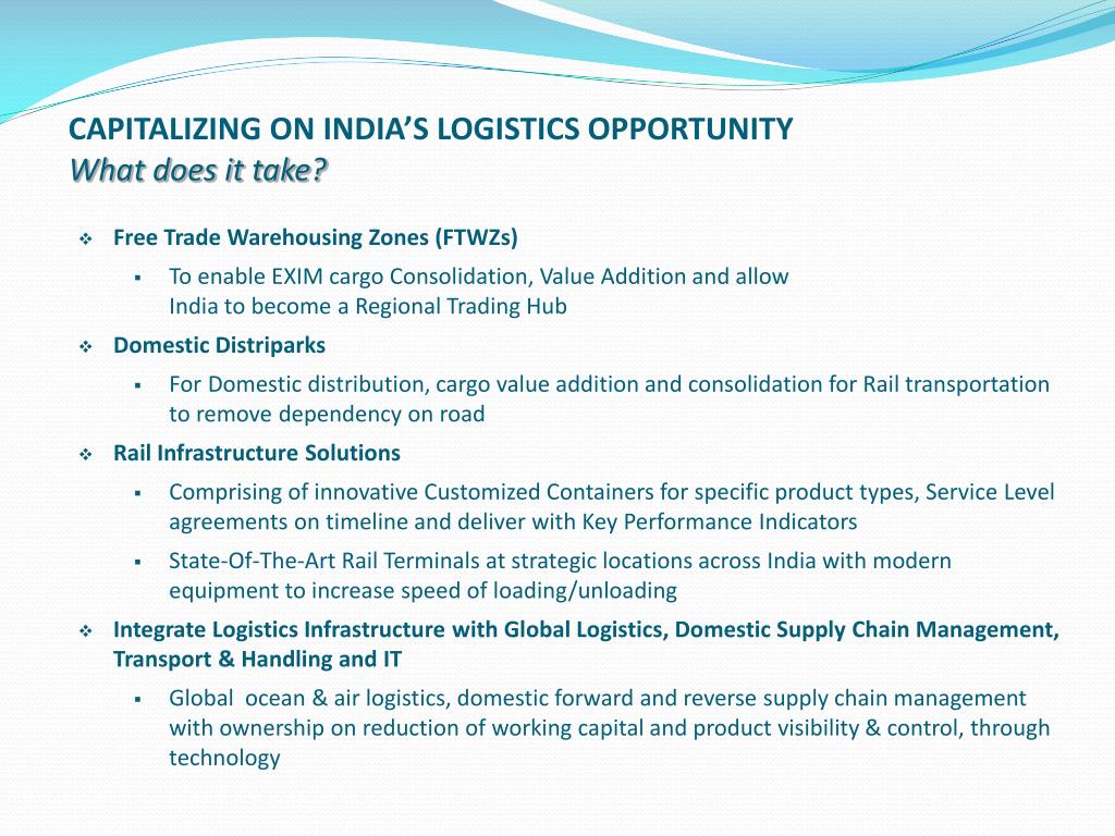CAPITALIZING ON INDIA’S LOGISTICS OPPORTUNITY What does it take? • Free Trade Warehousing Zones (FTWZs) • To enable EXIM cargo Consolidation, Value Addition and allowIndia to become a Regional Trading Hub • Domestic Distriparks • For Domestic distribution, cargo value addition and consolidation for Rail transportation to remove dependency on road • Rail Infrastructure Solutions • Comprising of innovative Customized Containers for specific product types, Service Level agreements on timeline and deliver with Key Performance Indicators • State-Of-The-Art Rail Terminalsat strategic locations across India with modern equipment to increase speed of loading/unloading • Integrate Logistics Infrastructure with Global Logistics, Domestic Supply Chain Management, Transport & Handling and IT • Global ocean & air logistics, domestic forward and reverse supply chain management with ownership on reduction of working capital and product visibility & control, through technology