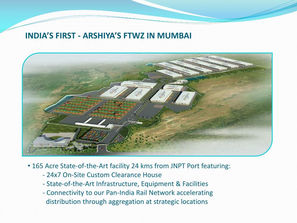INDIA’S FIRST - ARSHIYA’S FTWZ IN MUMBAI • 165 Acre State-of-the-Art facility 24 kms from JNPT Port featuring: • - 24x7 On-Site Custom Clearance House • - State-of-the-Art Infrastructure, Equipment & Facilities • - Connectivity to our Pan-India Rail Network accelerating • distribution through aggregation at strategic locations