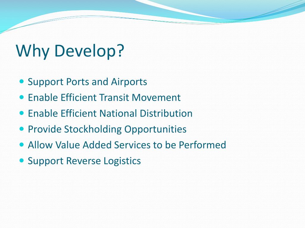 Why Develop? • Support Ports and Airports • Enable Efficient Transit Movement • Enable Efficient National Distribution • Provide Stockholding Opportunities • Allow Value Added Services to be Performed • Support Reverse Logistics