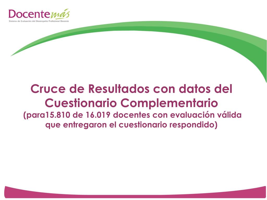 Cruce de Resultados con datos del Cuestionario Complementario (para15.810 de 16.019 docentes con evaluación válida que entregaron el cuestionario respondido)